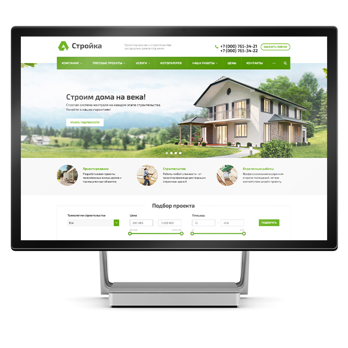 - структура сайта создана с учетом специфических потребностей строительного бизнеса: в меню сайта вынесены ключевые аспекты (реализованные проекты, типовые решения, цены и акции, услуги и т.д), на главной странице располагаются промоблоки с актуальными предложениями